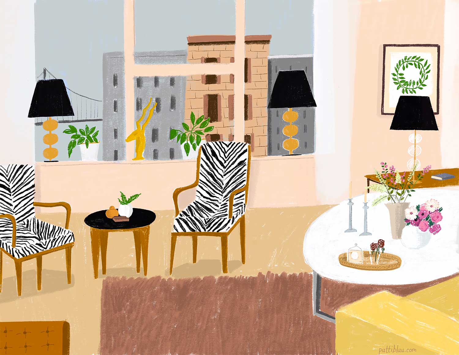 Patti Blau : J’ai travaillé comme décoratrice dans le cinéma. J’adore le design d’objet. J’adore les motifs et j’aime combiner les couleurs avec les motifs et construire l’espace, ce que permet le design d’intérieur. J’aime aussi décrire toute la diversité de cette vie quotidienne et les différents visages que les gens donnent à leurs maisons. Il n’y en a pas deux pareils. Beaucoup se ressemblent, mais chacun a une vision esthétique propre. J’aime beaucoup illustrer ces choix que font les gens.