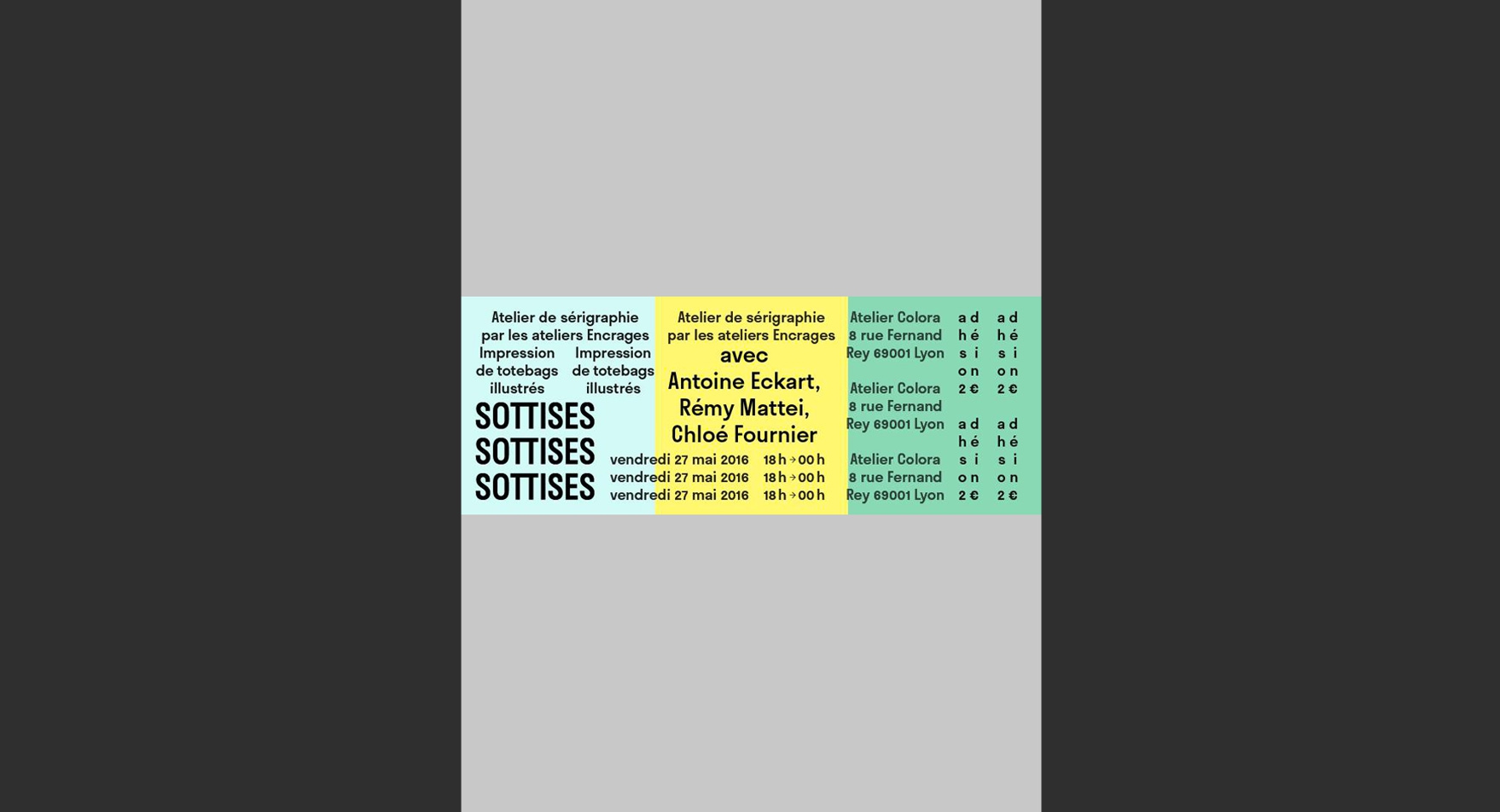 Vous ne le savez pas encore, mais vous faites des jaloux. A votre épaule pend négligemment l’objet de toutes les convoitises : le it-bag de l’été, griffé Chloé Fournier, Antoine Eckart ou Rémy Mattei. Le magazine Sottises invite les trois illustrateurs à l’atelier Colora vendredi soir pour un atelier d’impression de tote bags illustrés et personnalisés . On vous imagine déjà, un verre de punch à la main, la moue boudeuse et la hanche souple sur le son éclectique et savoureux de DJ Sentiments et Emeline XIII. Icônique.