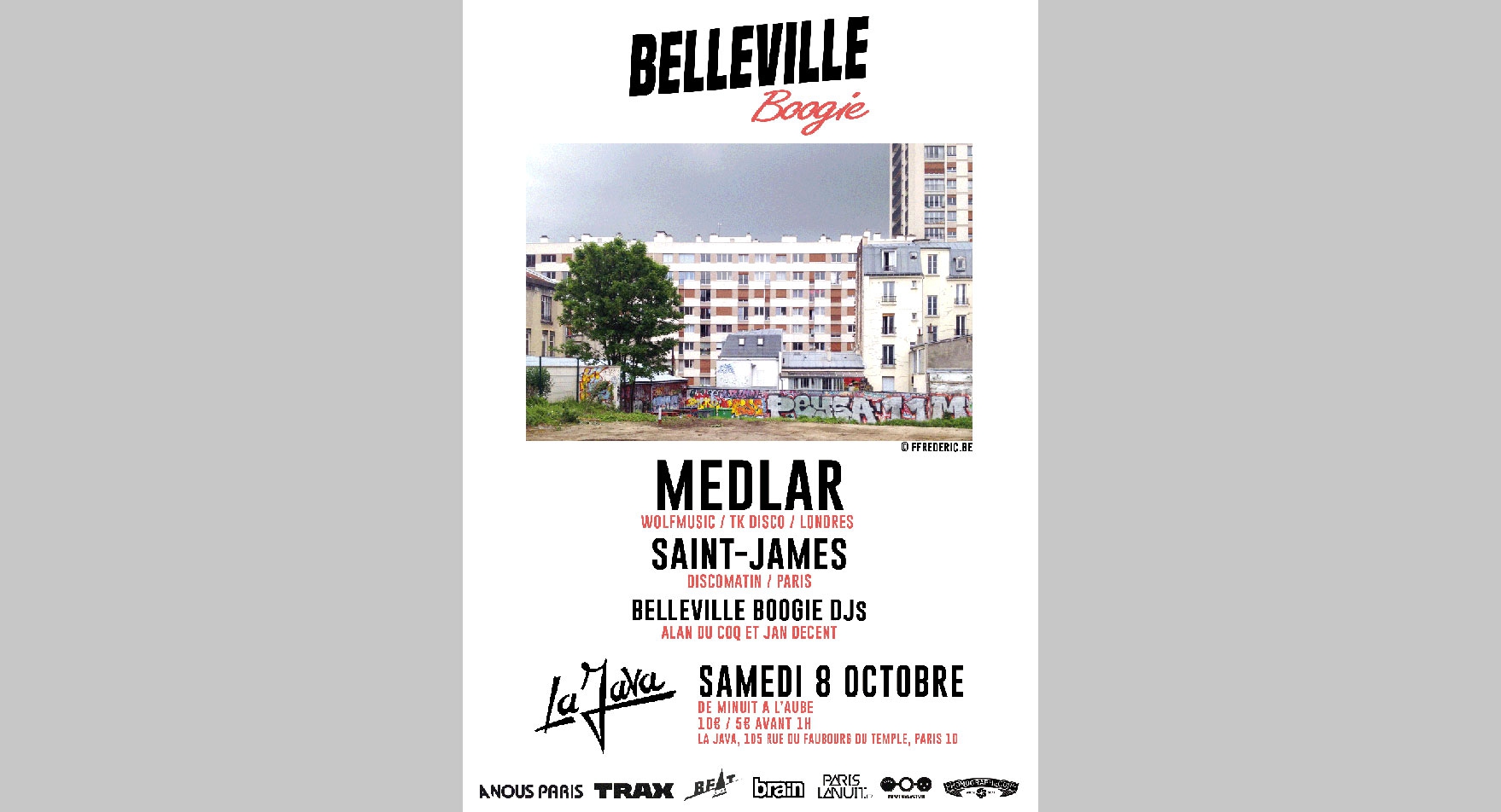Le crew Belleville Boogie, serviteurs sans faille du quartier du même nom, est de retour. Après son exposition au café La Maison qui rend hommage à la vie vibrionnante du quartier parisien, voilà qu’ils ont choisis le beau domaine de la fête pour rendre compte de leur fierté. Et c’est à La Java qu’ils invitent le Londonien Medlar (Wolf Music, TK Disco) et le local de l’étape Saint-James (Discomatin), accompagnés des inévitables Belleville Boogie DJs Jan Decent et Alan du Coq. Histoire de terminer le projet dans la liesse. Le 8.10 à La Java, à Paris.