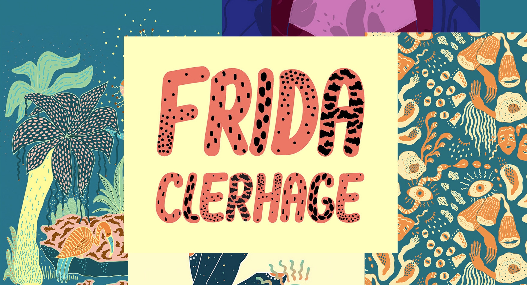 Aujourd’hui le chouchou de la semaine c’est la jeune illustratrice et graphiste Frida Clerhage, et elle nous vient de Göteborg, une jolie ville de Suède. Elle étudie actuellement à la HDK school of design and craft, où elle se perfectionne dans les beaux arts, après avoir étudié le design d’espace. Au cours des différentes étapes de son parcours déjà riche, Frida évolue dans un univers certes encore en définition, mais tout de même fascinant. Un monde empli de plantes, de motifs, de couleurs vives, d’animaux, de bout d’humains et de créatures hybrides qu’elle appelle « humanimals »(animal + humain, mais ça vous l’aviez compris). A découvrir sur son Instagram où son style se développe de jour en jour pour notre plus grand plaisir !